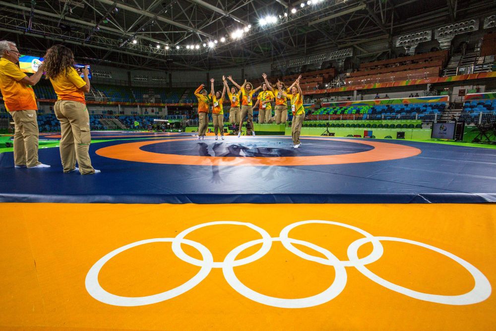 2016年8月18日,在里约奥运会摔跤场馆内,场馆工作人员和志愿者在摔跤垫上合影留念,这届奥运会的摔跤垫来自中国山东jinnian金年会集团。新华社记者刘彬摄